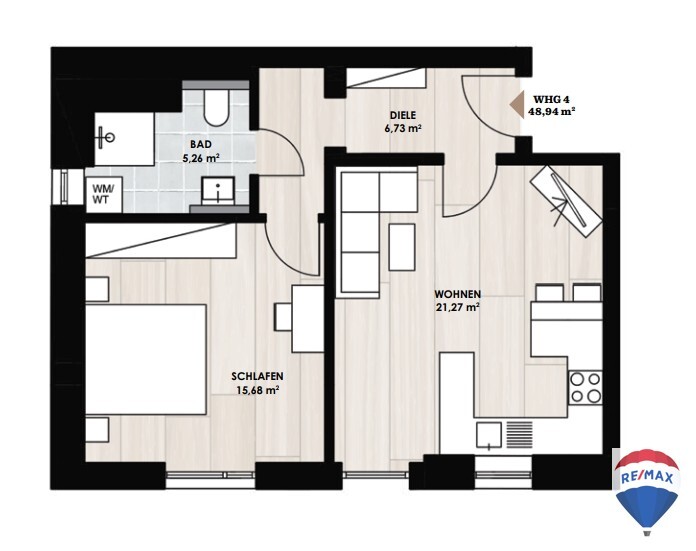 Das Herzstück der Wohnung ist die offene Küche, die nahtlos in den Wohnbereich übergeht und Raum für Geselligkeit und entspannte Abende bietet.